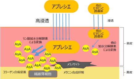 アプレシエ®は、リン酸型ビタミンC誘導体にパルミチン酸を加えることでお肌への吸収性やビタミンCへの変換率を高めた両親媒性(ビタミンC誘導体)です。